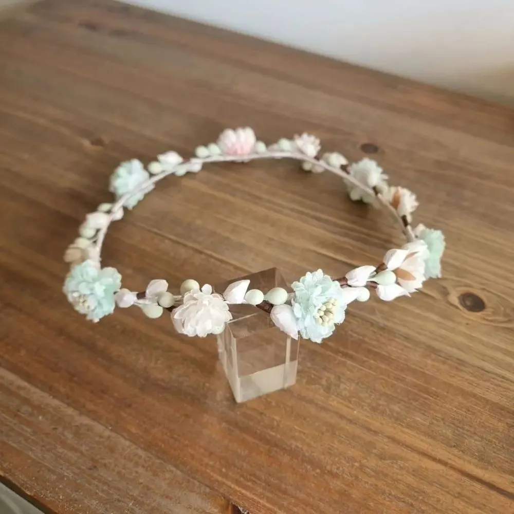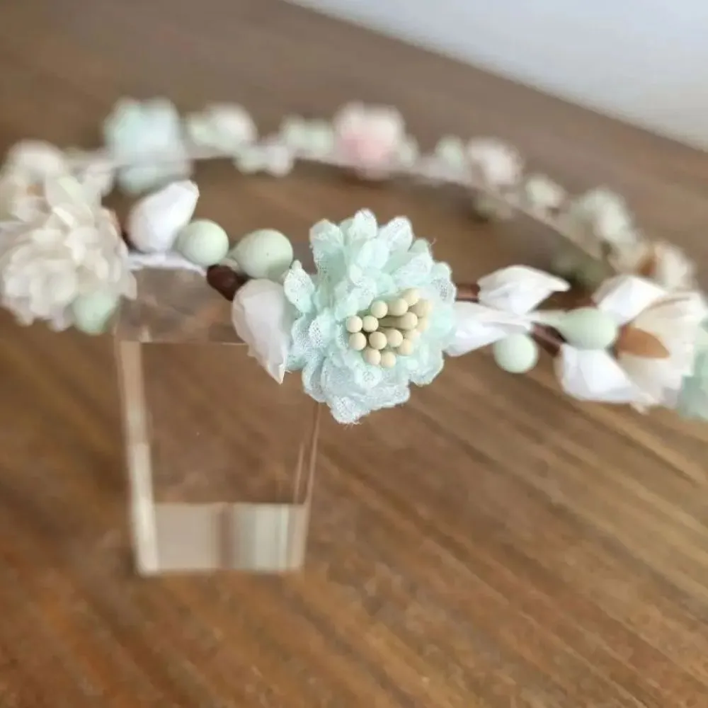 La Corona Sencilla Verde Agua es una pieza delicada y ligera, pensada para coronas de comunión. Su diseño floral en tonos verde agua y blancos aporta frescura y suavidad, ideal para un look infantil natural y elegante.
