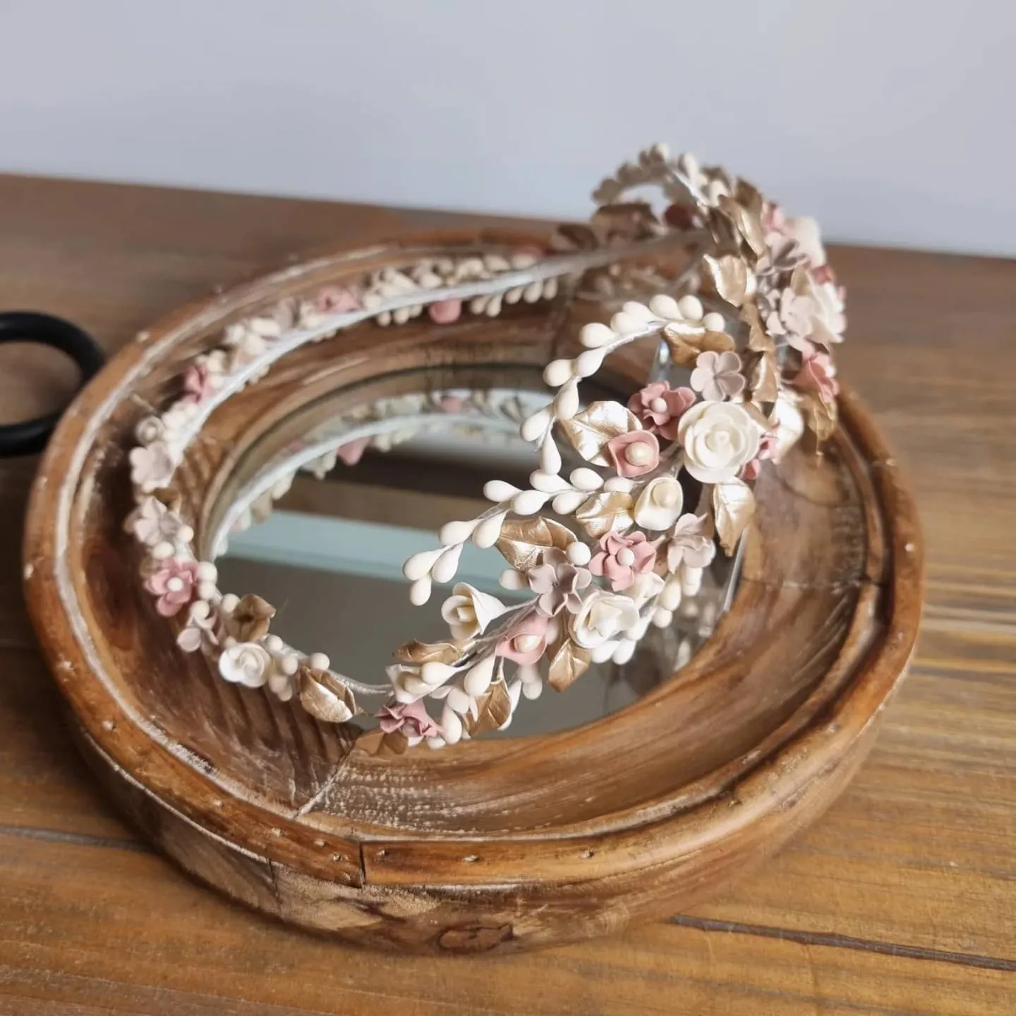 Corona de novia artesanal, elaborada a mano con delicadas flores en tonos marfil y suaves matices empolvados, combinadas con hojas doradas que aportan un sutil brillo. Su diseño ligero y armonioso envuelve la cabeza con naturalidad, creando un efecto etéreo y sofisticado. Ideal para novias que buscan un toque romántico, femenino y atemporal en su gran día.